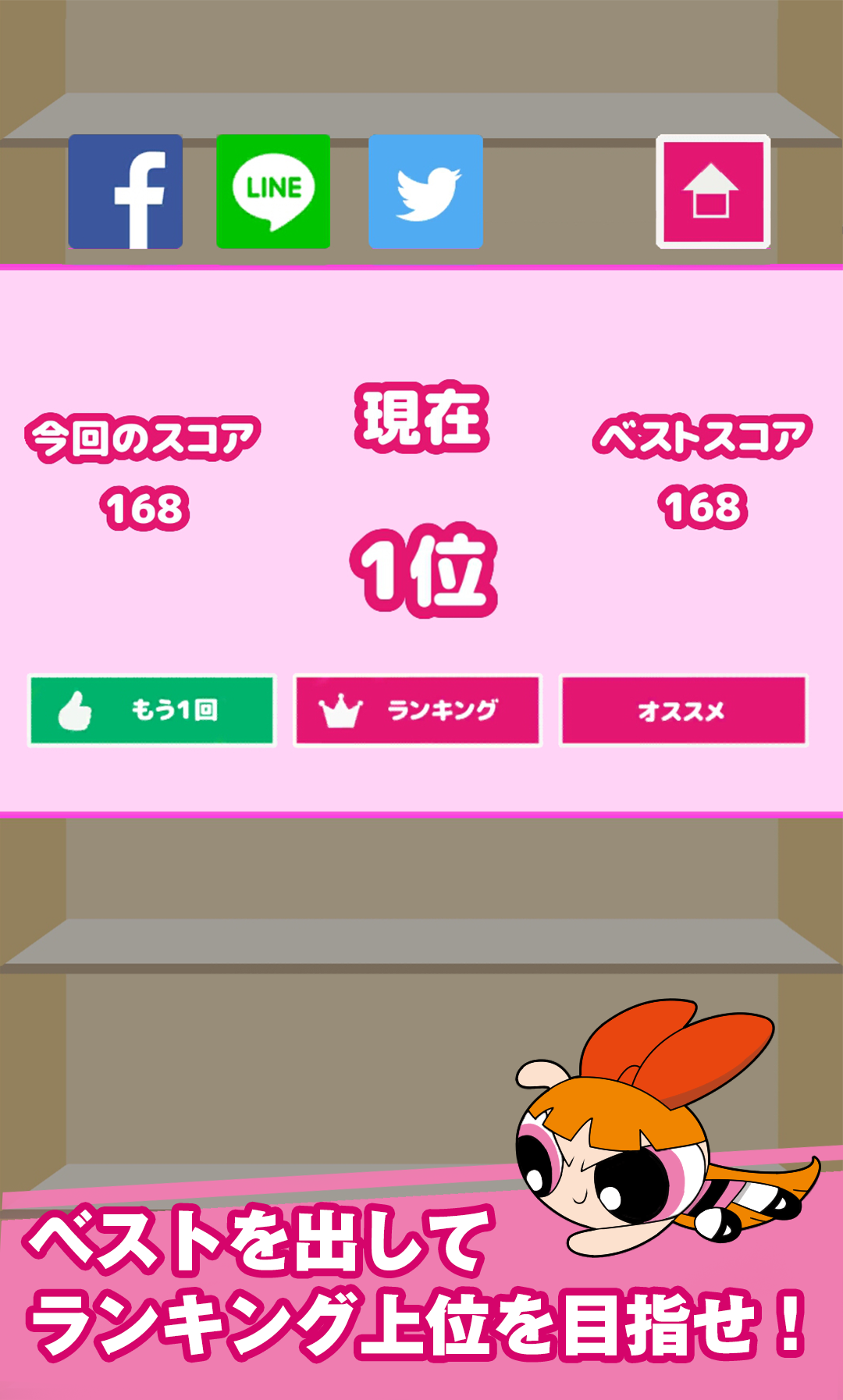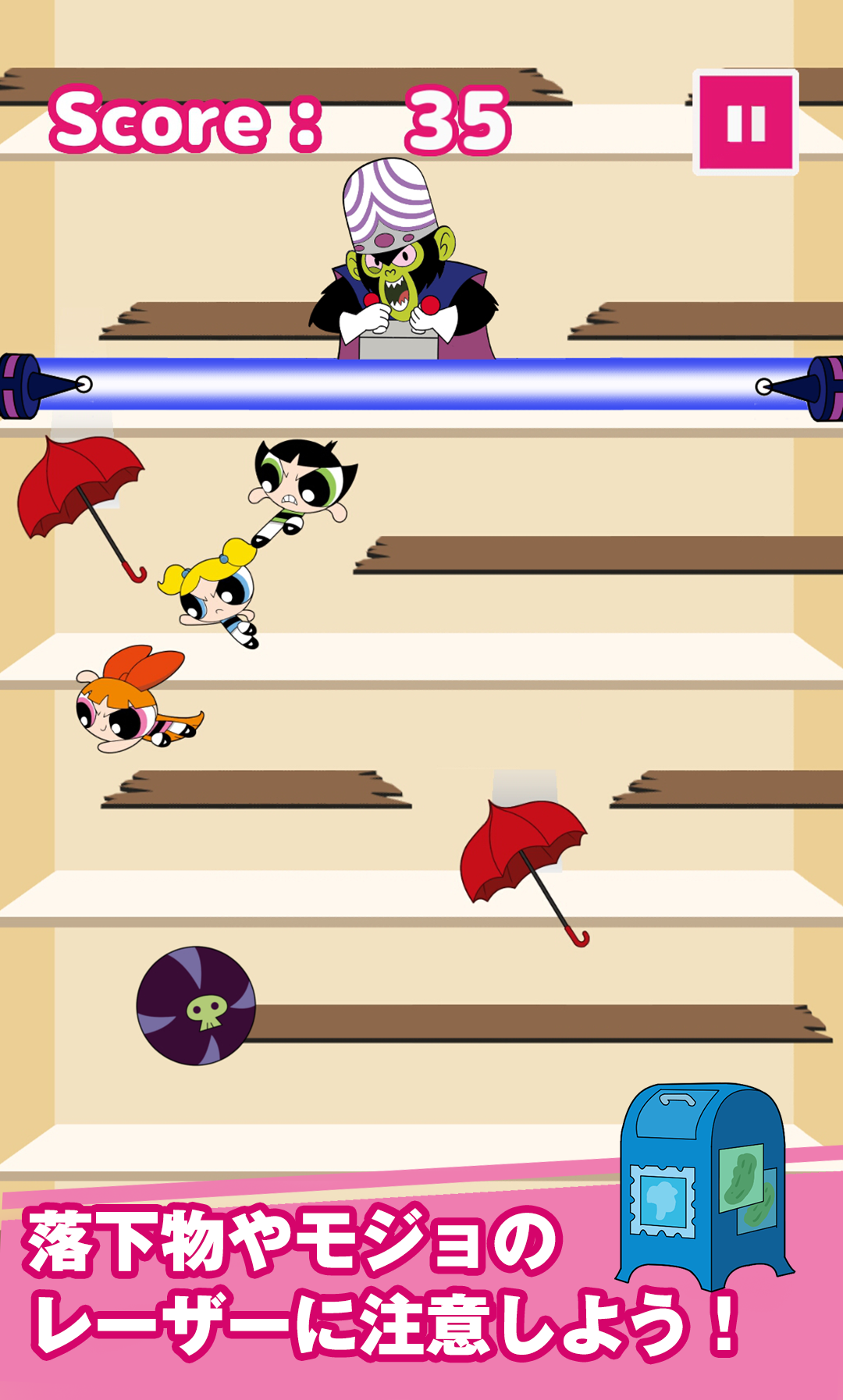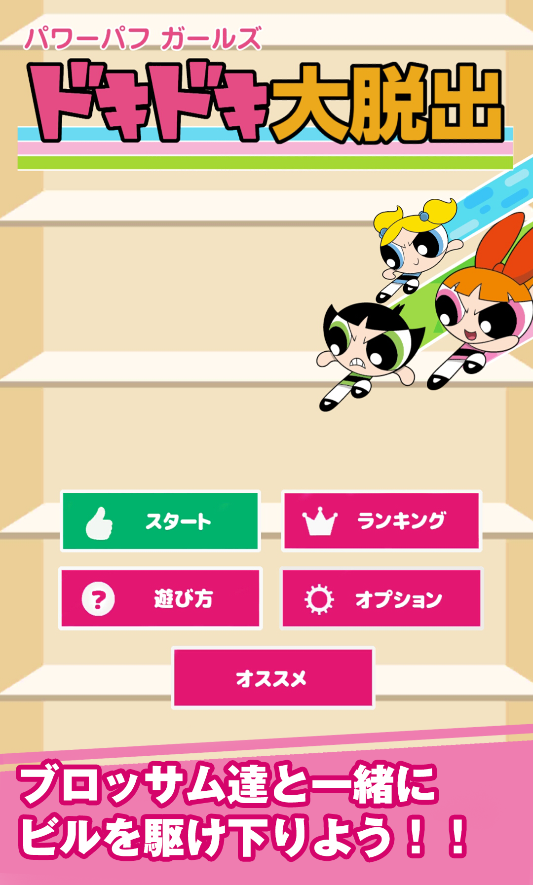 ブロッサムを操作して、ビルを駆け下りよう!! 上から来るモジョのレーザーや障害物には気をつけて! ケミカルXをとると一定時間無敵に! 途中でバターカップやバブルスと合流だ! ランキングで上位を目指せ!