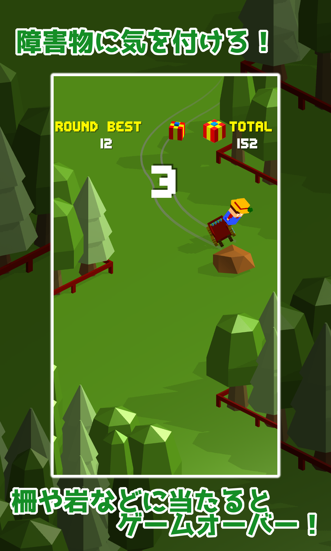 道中にある木箱や岩などの障害物に当たるとゲームオーバー!